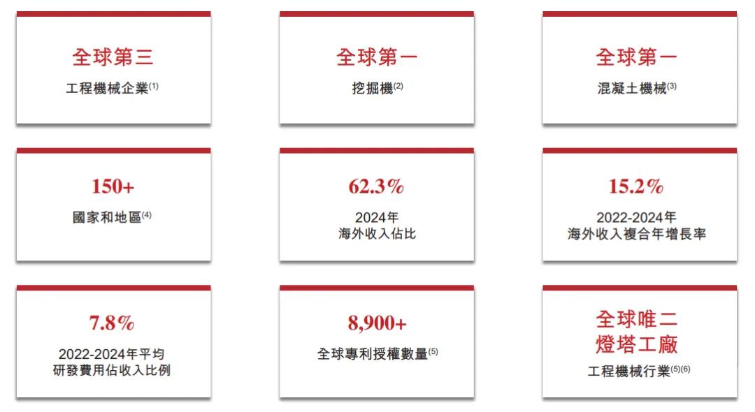 根据弗若斯特沙利文的资料,按2020年至2024年核心工程机械的累计收入计算,三一重工是全球第三大及中国最大的工程机械企业。于往绩记录期间,公司的产品已销往全球150余个国家和地区,2024年海外市场收入占公司总收入的62.3%。